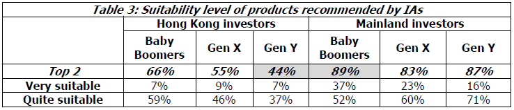 相比之下,只有59%的香港投资者认为产品是合适的,而第三代的差距更为严重。 (表3)